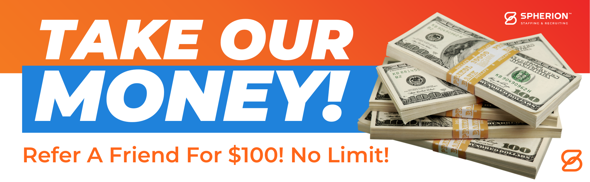 No Limits, and you DON'T have to be a Spherion Employee to refer someone! Paid as a $100.00 Amex Gift Card so it's tax-free and can be used almost anywhere. Refer as many times, and as often as you would like!